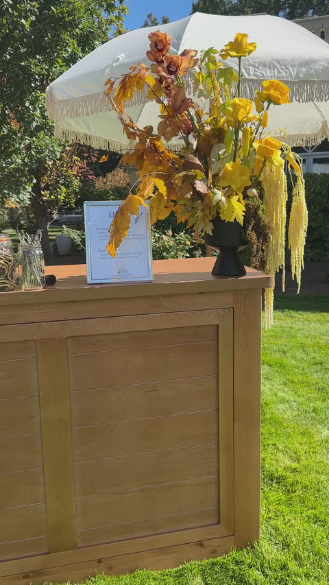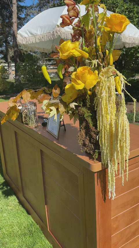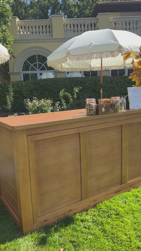 Bartenders on the move, rejoice! Our foldable Chestnut Mobile Bar brings the party wherever you need it. Perfect for weddings and events where drinks need to flow and good times need to roll! This nifty bar provides ample space for your mixology magic while adding rustic charm to any celebration. Why settle for a boring table when your bartender can shake and stir behind this crowd-pleasing portable masterpiece?