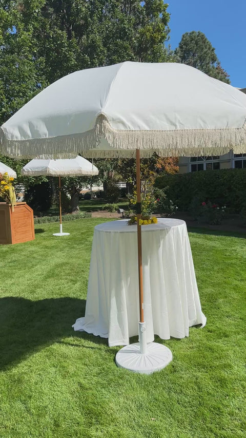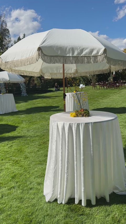 Enhance your wedding or event with the elegant Ruffled Outdoor Umbrella. Featuring a charming ruffled fringe, it offers perfect shade while adding a stylish touch to any outdoor setting. Rent this beautiful umbrella to create a comfortable, shaded space that your guests will appreciate.
